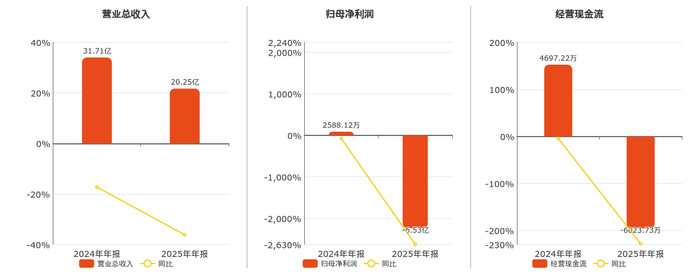 公司营业总收入为20.25亿元,较去年同报告期营业总收入减少11.46亿元,同比较去年同期下降36.15%。归母净利润为-6.53亿元,在已披露的同业公司中排名第85,较去年同报告期归母净利润减少6.79亿元,同比较去年同期下降2623.93%。经营活动现金净流入为-6023.73万元,在已披露的同业公司中排名第78,较去年同报告期经营活动现金净流入减少1.07亿元,同比较去年同期下降228.24%。